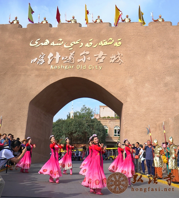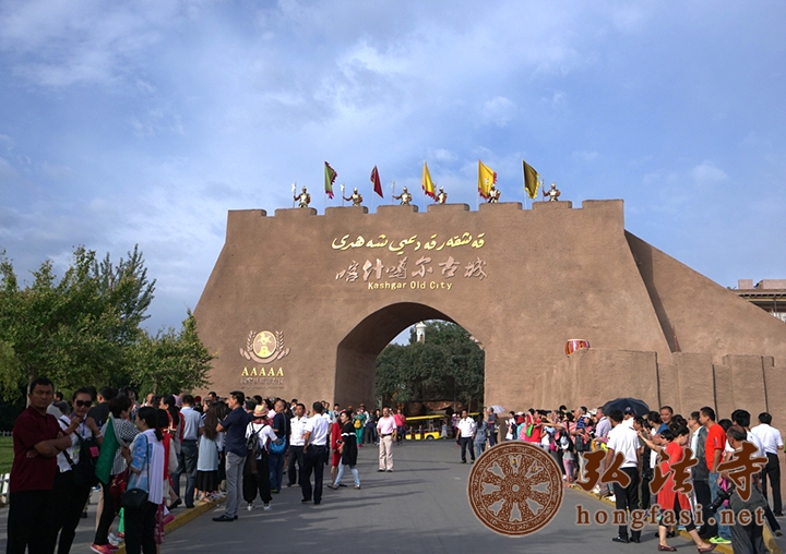 在喀什市喀什葛尔古城前观赏宏伟城门