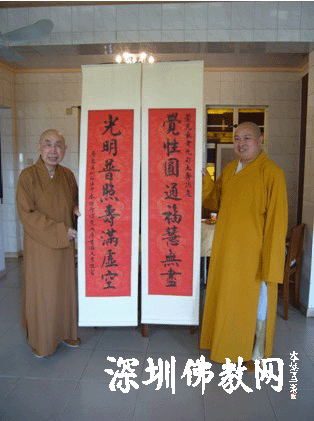 深圳佛教新闻网讯:6月1日,印顺大和尚一行专程赴港,为香港佛教联合会主席、香港正觉禅苑住持觉光长老即将到来的九十岁寿诞敬献贺礼,受到了觉光长老的热烈欢迎。座谈会上,印顺大和尚代表本换长老及弘法寺东西两序对觉光长老的寿诞表示祝贺,并敬献了寿诞贺联“觉性圆通福慧无尽,光明普照寿满虚空”。