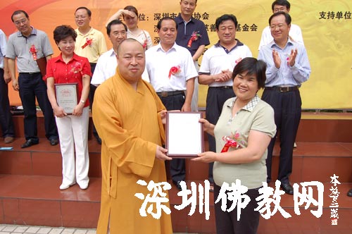 手术全部顺利进行后,29日上午,“湖南益阳——衡阳光明行”活动圆满祈福仪式在南岳福严寺隆重举行,深圳市佛协常务副会长赵利生,副会长心静法师、萧七妹,秘书长李艾峻;衡阳市副市长肖彬,湖南省政协常委、湖南省佛教协会副会长、南岳佛教协会会长大岳大和尚,衡阳市委统战部副部长陈群洲等有关领导出席了仪式并互赠了牌扁。