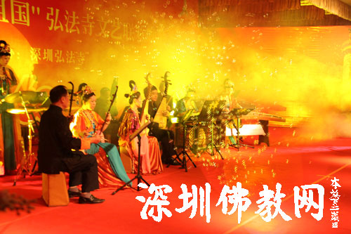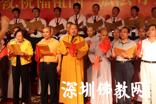 最后,印顺大和尚、市有关领导和大家一起登台共同演唱了《歌唱祖国》,并和全体演职人员合影。