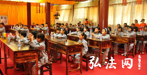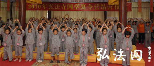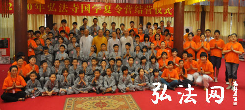 弘法网讯:盛夏,美丽的梧桐山下迎来了五十四位活泼、可爱的少年儿童,他们开心欢喜地参加了2010年7月16日至22日在弘法寺举办的第二届国学少儿夏令营。