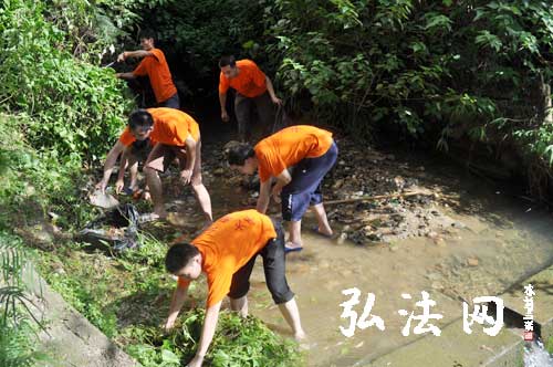 弘法网讯:今天是农历十五,弘法寺人流如织。在寺院后门旁的水渠里,几位身着橘红色义工服的居士,站在污水里除草、搬石,用双手清理渠里的淤泥和杂物。炙热的高温让人汗流浃背,汗水湿透了他们的衣服。由于台风刚过,深圳的温度又骤然上升,雨后正是蚊虫滋生和肆虐的时候,不一会,他们的手臂和腿上都被蚊虫叮咬得到处是红色的疙瘩,但是可敬的义工们却没有停歇,没有人抱怨,没有人偷懒,甩掉头上的汗水,继续埋头干活。