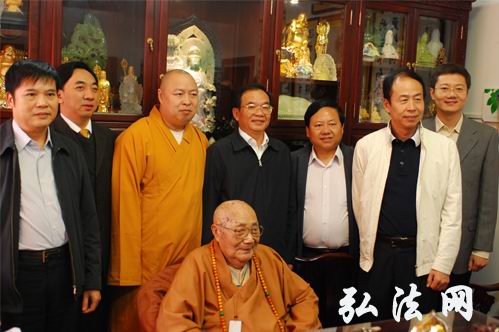 刘书记和倪区长代表区委、区政府向本老送上了生日花篮和礼物,祝福本老104岁寿诞庆典吉祥圆满。刘书记对本老说,您老人家德高望重,一生慈悲济世,造福社会,值得大家尊重。祝福您老身体健康,宝掌千年。本焕长老笑容满面,非常欢喜,他向刘书记一行表示了感谢,祝愿他们工作顺利,事事顺利,永远顺利!并邀请刘书记一行合影留念。