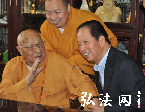 弘法网讯:3月24日上午,原最高人民法院院长肖扬一行在深圳市政府相关领导的陪同下到深圳弘法寺看望了中国佛教协会名誉会长、105岁的当代佛门泰斗本焕长老。受到本老和中佛协副会长、弘法寺方丈印顺大和尚的热情接待。