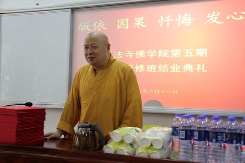 弘法网讯:2013年8月11号中午12:30分,经过21天紧张充实的学习,弘法寺佛学院第五届执事培训班即日圆满结业。在弘法寺佛学院第六课室,中国佛教协会副会长、弘法寺方丈印顺大和尚亲自为学员颁发结业证书。面对来自全国各地的40余名僧伽学员,印顺大和尚深情寄语,“今天的结业并不是结束,而是新的开始,希望大家能够做适应时代、融入社会的现代僧人,有激情、有责任感和使命感;希望大家都心怀梦想,都能做带头人,要有舍我其谁,敢于承担的精神,用每个人的激情和梦想点亮这个时代的激情与梦想,创造出未来无穷的世界。”
