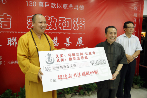 印顺大和尚有着传奇般的成长经历,他饱经磨砺,在佛教学术上造诣甚深,他不仅继承而且发扬了本焕长老的优秀精神与传统,他坚持以道风建设为中心,以慈善和文化为两翼的宗旨,带领弘法寺积极参与社会慈善和公益事业,多年来,弘法寺为社会兴办希望学校、建医院、修桥铺路、赈灾扶贫、文化事业等捐款达数千万元。印顺大和尚不仅是一位令人尊敬的慈善家,而且是位具有很深艺术修养和书画造诣的艺术家和鉴赏家。他不但赞赏魏达志的品格与学问,而且被他作为高校教师的义举所感动,因此决定弘法寺投入巨资130万元一次性购买收藏此次拍卖的全部作品,以助力深圳首家清真寺的建设。