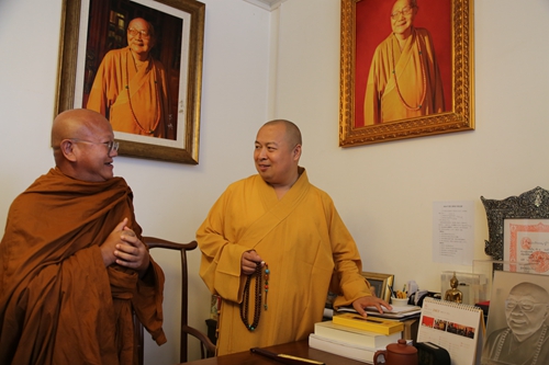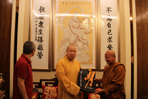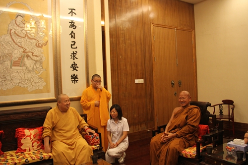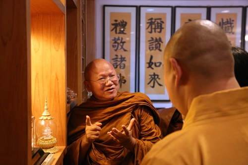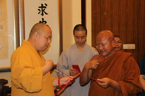 弘法网讯:2013年9月19日,恰逢中秋佳节,喜气盈门的弘法寺迎来被称为泰国最“和谐社会”的老虎寺之住持Chan(Phra Achan)一行到访。中国佛教协会副会长、弘法寺方丈印顺大和尚亲切接见故友,促膝畅谈中泰两国佛教界的友好交往。期间,宾主交谈甚欢,互赠礼品,并期待进一步更多的佛教交流与慈善互助。