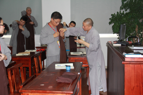 弘法寺佛学院第六期居士初级培训班自9月23日开班以来,丰富多彩的课程内容引导学员理行深入,令学员受益匪浅。弘法寺中勇法师带领大家学习佛教行仪课程,他从佛陀证道、弘法等言简意阂故事自然引入到佛门威仪,生动鲜活的授课方式让课室充满了温馨欢乐的笑声;包括为大家示范如何动静结合地折叠海青、如何如法拜佛、怎样行堂等环节,更让大家惊奇钦佩连连,大呼“原来法师们很博才啊!”、“一天就了解了这么多新鲜的内容真超过我预期”。