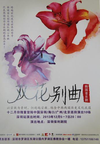 弘法网讯:由深圳弘法寺、韩中佛教文化交流协会策划承办公演的一部超越宗教,代表韩国创作音乐剧最高水平的大型史诗音乐剧《双花别曲》,将于2013年12月5日开始,从深圳站始发,开始在中国四大城市公益上演。
