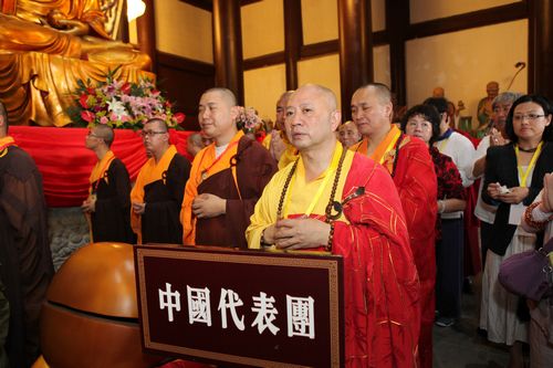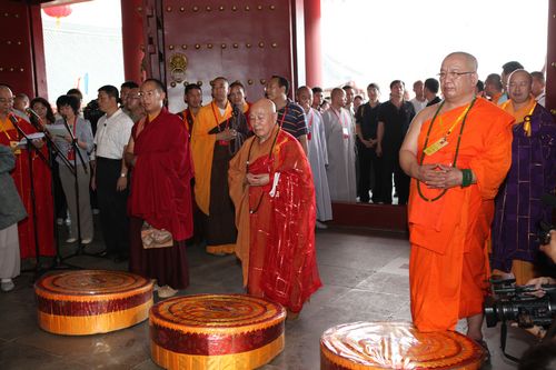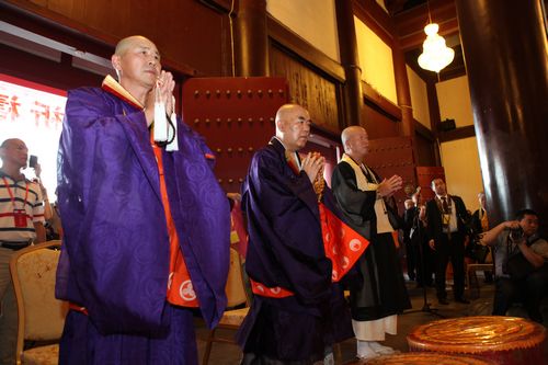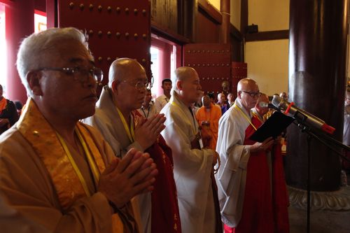 祈祷法会由中国佛教协会副会长学诚大和尚主持。首先是中方诵经,由中国佛教协会会长传印长老和副会长班禅额尔德尼·确吉杰布、祜巴龙庄勐共同主法,副会长明生大和尚宣读“和平祈祷文;韩国是由韩国佛教宗团协议会会长慈乘长老慈乘长老宣读“和平祈祷文”;日本由日中韩国际佛教友好交流协议会副理事长武觉超宣读“和平祈祷文”。三国佛教代表团分别按照佛教仪规诵经礼佛,共同祈祷佛日增辉、人民安乐、社会和谐、世界和平。