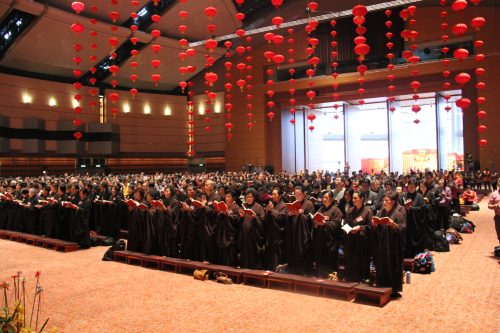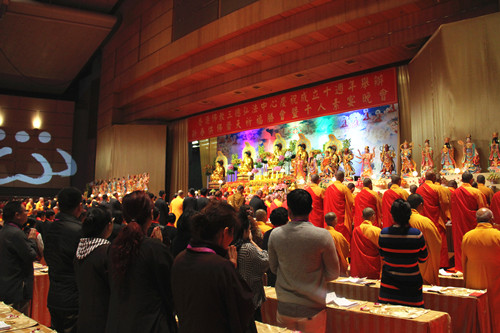 弘法网讯:2014年2月5日(农历正月初六),为庆祝香港佛教三德弘法中心成立十周年庆典,香港会议展览中心新翼三楼大会堂隆重举行了新春供佛斋天祈福法会。来自海内外及两岸四地的高僧大德受邀出席了法会,共同祈祷世界和平、祖国昌盛、香港稳定繁荣、民生安定。中国佛教协会副会长、弘法寺方丈印顺大和尚亦受邀出席了此次法会。