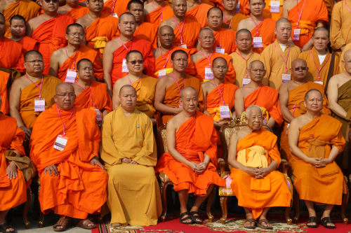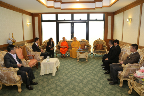 印顺大和尚率领中国佛教代表团一行受到了泰国政界与佛教界的友好接待。上午8点,泰国副总理长吉迪腊,原中国驻泰国大使馆文化参赞秦裕森及副僧王帕波玛师提长老在朱拉隆功佛教大学接见了印顺大和尚,随后,泰国现任僧王颂德·帕·摩诃拉查曼克拉赞长老亲临朱拉隆功大学,与印顺大和尚做了亲切交流。现任僧王与此次会议的全体僧众及居士们合影留念。