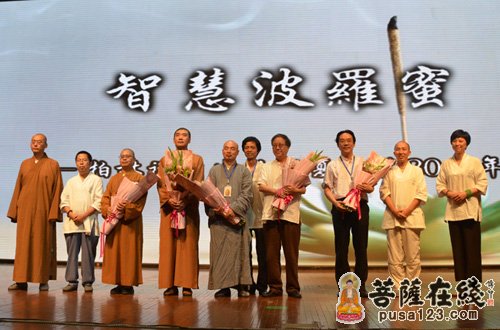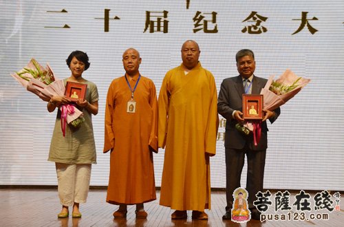人世沧桑,年华流逝,在滚滚红尘中,在这个特殊的时刻,当第一届夏令营的师生们再度相逢时,个中的心慰和喜悦,感恩和祝福,自然无以言表。生活禅夏令营让素昧平生的师生们走在了一起,从此师生之间、佛与学子之间结上了殊胜的法缘,这个法缘已经让数以千计的轻年学生,以及他们的父母、朋友,与佛陀联通在了一起,而且,尽未来际,将相续不断,不弃不舍,展转增上,共趋光明之海。这是一个多么奇特和不可思议的因缘啊。师济群法师代表全体授课老师发言,说出了如下这段话:“大众认同,大众参与,大众成就,大众分享”,这十六字方针,是净慧老和尚提出来的关于生活禅的做事理念。生活禅夏令营之所能够坚持到今天,而且越办越好,与众多的护法居士慷慨解囊分不开,与众多义工长期以来默默的奉献分不开。为了表达对这些护法居士和义工的感谢,大会将护法居士代表香港旭日集团总经理杨勋居士、北京荷塘月色素食馆经理夏泽红居士请上席台,接受了营员代表的献花和净慧老和尚生前书写的“慈悲喜舍”墨宝;贾智慧居士、赵增军居士、张绍洪居士、向晓云居士、田鹏居士、黄帅居士、许书信居士、李晓林居士等,作为义工代表,亦随后被请上主席台,接受了净慧老和尚书写的“清风无价”之墨宝。