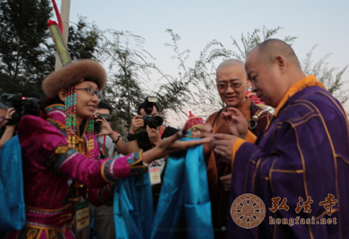 弘法网内蒙古讯:10月3日中午,印顺大和尚亲自率领的150人护法团乘专机护送本焕长老舍利前往内蒙古。深圳护法团一到达包头国恩禅寺山门,热情好客的蒙古人民即上前为客人献上哈达,并用富有民族特色的歌舞迎接客人。