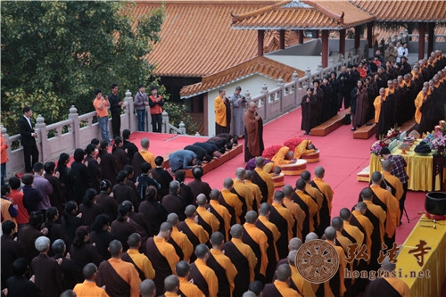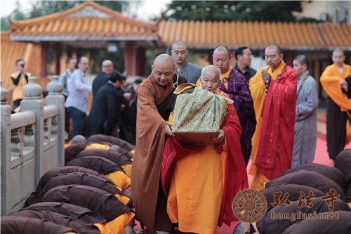 5日早上6:00,深圳弘法寺在法堂隆重举行了护送本焕长老舍利赴湖北新洲报祖寺供奉仪式。仪式由中国佛教协会副会长,湖北省佛教协会名誉会长,海南省佛教协会会长,深圳弘法寺方丈印顺大和尚亲自主持法会,报祖寺住持、本焕长老的师弟本乐长老代表报祖寺亲自到弘法寺恭请长老舍利。仪式圆满结束后,本焕长老舍利由法师护送团护送至湖北新洲仓埠报祖寺永久供奉。