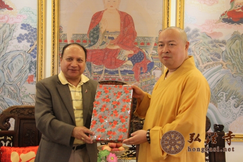 交流中,印顺大和尚回顾了中尼两国佛教友好交流事迹并感谢施瑞斯塔部长对尼泊尔中华寺的二期工程建设所做出的积极贡献,他表示:希望中尼两国的佛教友好关系能一直延续下去,尼泊尔几千年能一直保持纯朴的民俗民风,不受外界过多影响,从某种意义来说非常了不起。蓝毗尼作为佛陀的诞生地,因缘殊胜,是佛教徒心中的圣地。我们很愿意从经济到人员各方面给予帮助与支持,帮助其成为未来最重要的世界佛教中心。印顺大和尚还就如何加快蓝毗尼的发展与改革谈了具体的合理建议。施瑞斯塔部长十分感谢印顺大和尚的关心,非常高兴能加强与弘法寺的交流。他表示近年来中尼两国的佛教文化外交频繁,友谊不断加深,期望今后能加快合作进程。双方互相赠送了精美的佛教礼品,合影留念。