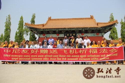 弘法网讯:2014年4月29日上午,中国驻尼泊尔大使吴春泰夫妇,尼泊尔大使馆郑勇主任,经济商务处攀金科,中国国际公司总裁吴光权,蓝开委主席、副主席、秘书长以及尼泊尔文化部、旅游部、民航部的一行相关领导嘉宾在尼泊尔中华寺举行了中国赠送尼泊尔60架飞机祈福法会。