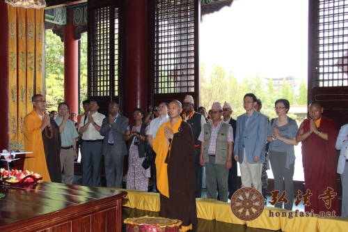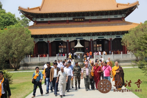 中国佛教协会副会长、南海佛教协会会长、深圳弘法寺及中华寺方丈印顺大和尚委托尼泊尔中华寺当家中勇法师主持本次飞机祈福法会。法会由中勇法师引领中尼领导次第拈香祈福,蓝毗尼内十几个不同国家寺院的僧侣在中华寺大雄宝殿诵经祈福。香云袅袅,梵乐悠扬,缕缕香云掀开中尼和谐邦交的新篇章,声声佛号汇集中尼两国领导人的一个共同心愿:中尼友谊长存。祈福法会在如法如仪中圆满结束。其后,尼泊尔中华寺当家中勇法师受印顺大和尚的委托陪同一行领导参观寺院,并详细介绍了中华寺弘法工作情况。