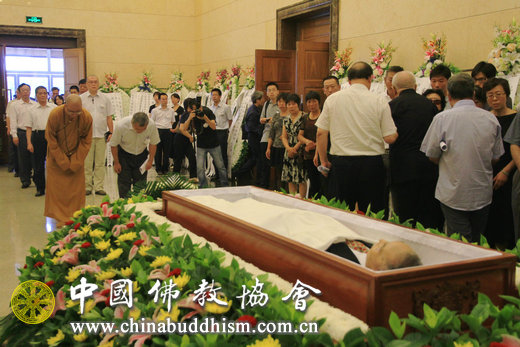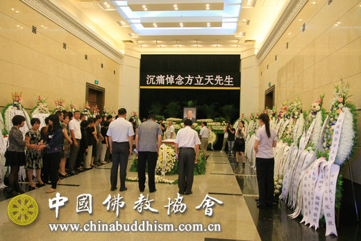 11日上午,八宝山革命公墓礼堂庄严肃穆,哀乐低回。方立天教授的遗体安卧在鲜花丛中。各方代表前往北京八宝山革命公墓参加送别仪式。