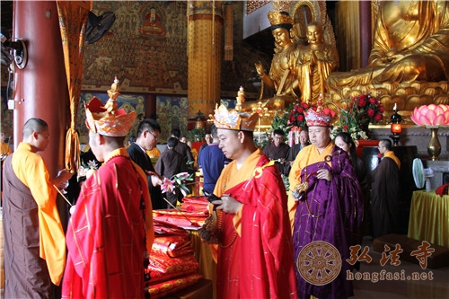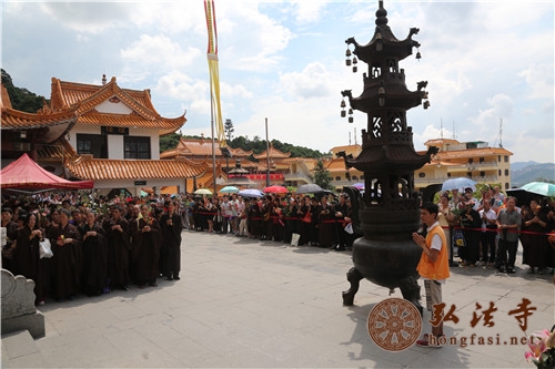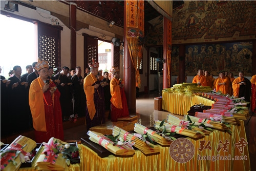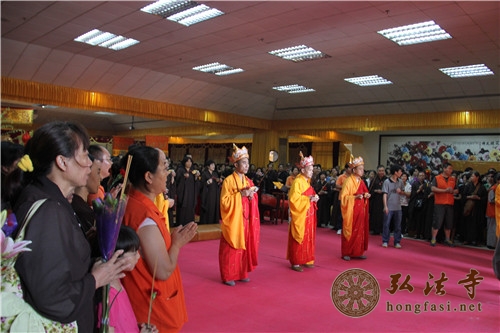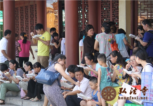 2014年8月9日下午,弘法寺连续七天的“法界圣凡水陆空普度大斋法会”功德圆满,举行了庄严的送圣仪式。送圣队伍长数百米,随喜参与仪式的十方信众近千人,无不手捧鲜花,法喜充满。