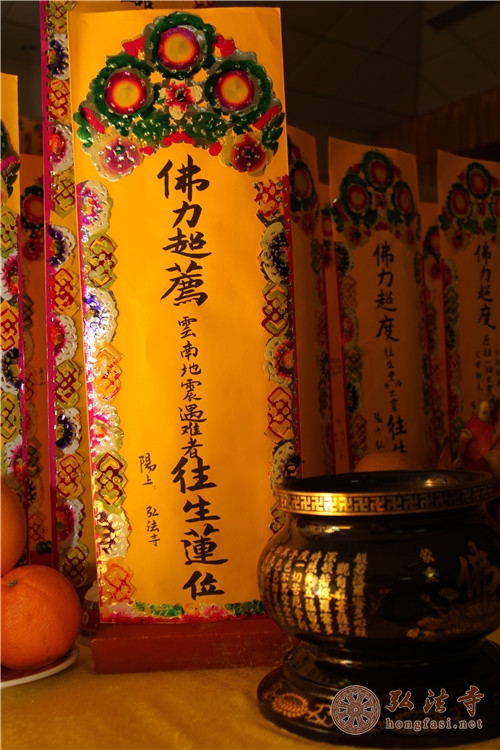 云南昭通市地震迄今已一周,弘法寺水陆法会诵经超度祈福之时,于内坛中摆放云南地震遇难者往生莲位,每天夜半良辰开坛,法施水陆科仪文和地藏经水忏及说幽冥戒等,为亡灵超度,为生还者祈福。