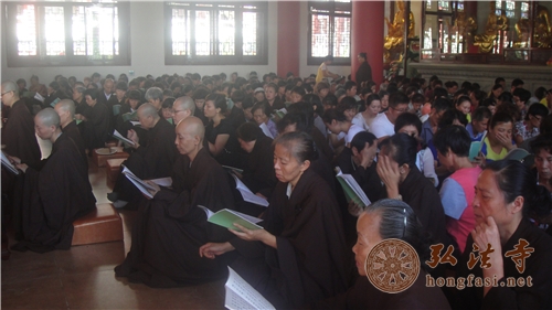 8月10日上午,一千多名四众弟子纷纷来到泰华庵,互相交流学佛的体会和心得。僧众手持《佛教念诵集》,高声朗诵“盂兰盆经”等佛教经典。佛出世间以利生为本怀,凡有所作,皆想带给众生安乐,拔除众生痛苦,所以,若见众生,舍恶向善,转迷成悟,返妄归真,离苦得乐即畅佛出世本怀故佛欢喜。