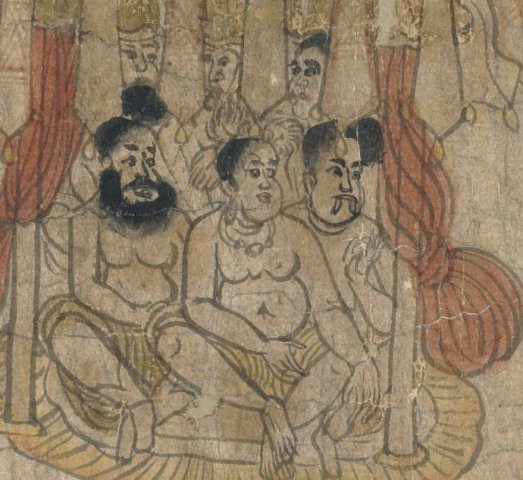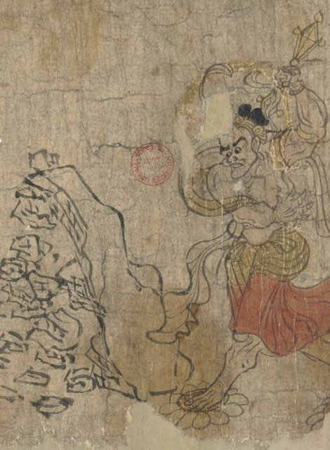 第一个回合,金刚智杵破邪山;画面最右侧因破损,舍利弗与诸弟子的画面已失。最右侧第一个登场的是舍利弗化现的大力金刚,正高举金刚杵,奋力砸向劳度叉所化现的一座大山。中间的六人为劳度叉及眷属,最左侧为观看斗法的国王及大臣须达长老及眷属。