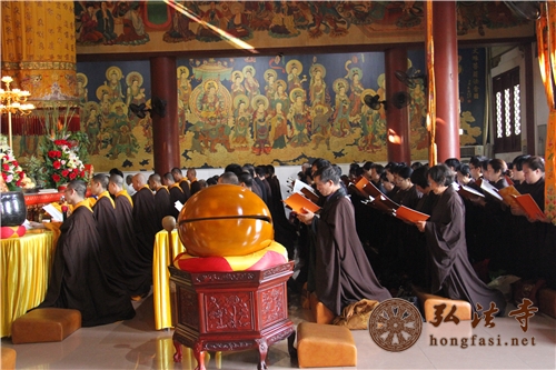 上午8点整,法会开始。大雄宝殿香烟袅袅,花果供献,弘法寺两序大众和护法信众依礼站班,肃穆庄严,神情恭敬,在维诺师的引领下,法师、护法一一礼拜,与会大众共同持咒诵经。阳光普照,梵乐安详,僧众一唱三叹,如法如律。