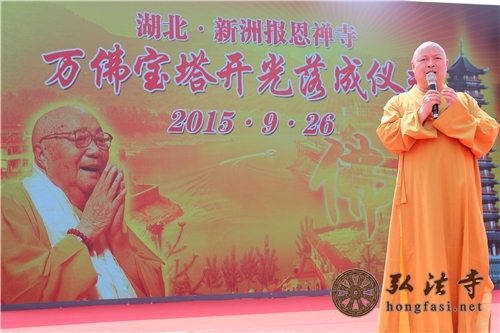 依开光仪轨,主法高僧为万佛宝塔“拂尘”、“照空”、“点眼”。开光现场隆重庄严,中国佛门泰斗本焕长老出家的报恩禅寺花吐妙香,祥云降瑞。在喜乐祥和的气氛中,省、市有关领导及主法高僧大德在万佛宝塔开光庆典仪式上纷纷致辞祝贺。落成仪式由新洲区政协主席王建生主持,中国佛教协会副会长演觉大和尚代表中国佛教协会宣读贺信,中国佛教协会秘书长刘威代表中国佛教协会赠送墨宝。