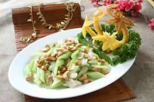 (1)西芹洗净削皮,切成菱形块;百合掰开洗净;腰果用油炸熟备用;