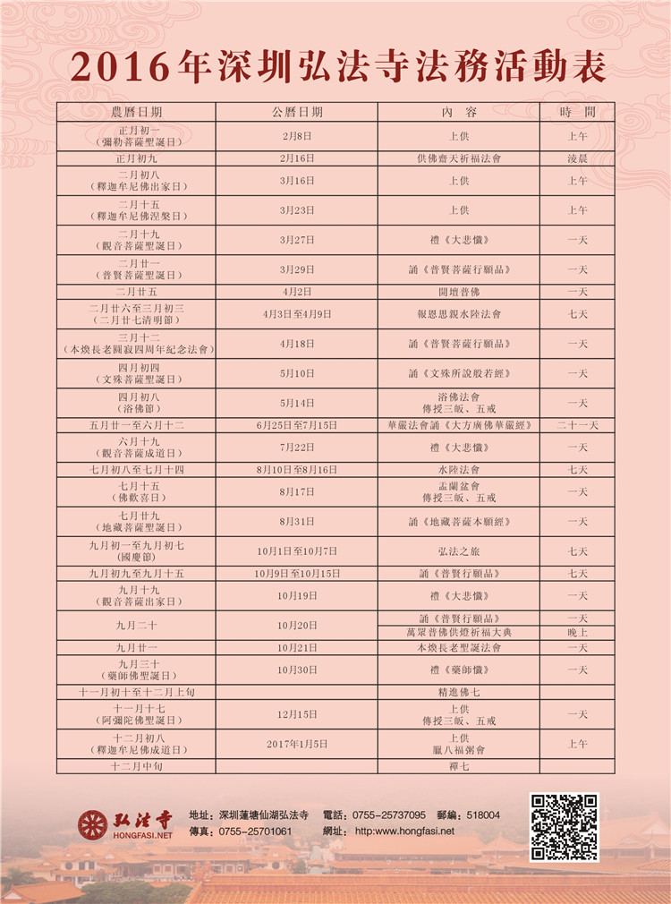 深圳弘法寺2016年法务活动表。