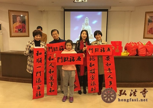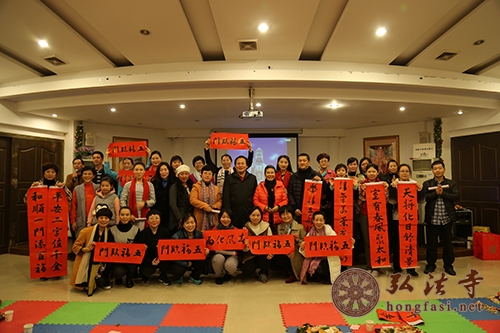 2016年1月18日下午,弘法寺志愿者协会公益书法班举行了2015年“散学典礼”,弘法寺志愿者协会秘书长戴新莉,中国书法家协会会员、中国教育学会会员、中国教育学会书法专业委员会会员、弘法寺志愿者协会公益书法班老师李传军,公益书法中级班、初级一班、初级二班、初级三班学员及协会工作人员共六十多人参加。