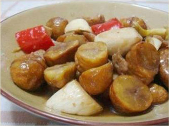 原料:板栗、茭白、大豆蛋白、红菜椒做法:1、把栗子皮剥去。2、茭白切滚刀块;大豆蛋白用水泡软,挤干水份;红菜椒切块。3、栗子、大豆蛋白和茭白分别用油炸过备用。4、起热少许油,爆香姜丝,依次放入红菜椒和上述...