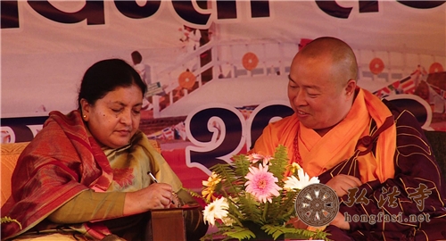印顺大和尚与尼泊尔总统比迪娅(中)、尼泊尔总理奥利(左)在主席台就坐