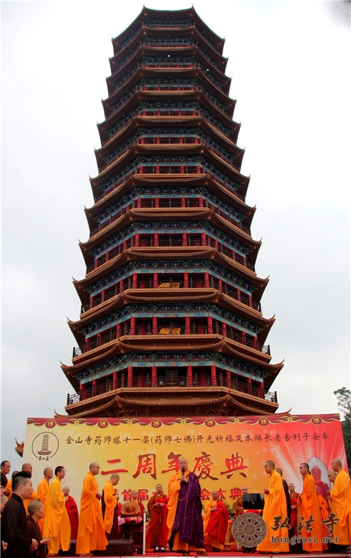 纪念活动结束后举行金山寺药师塔药师七佛开光祈福法会,印顺大和尚领众主法,各高僧大德拈香、持诵经文、香花请圣。随着高僧大德法音的结束,金山寺药师塔药师七佛开光法会圆满成功,共同祈愿本焕长老乘愿再来,普度众生,祈愿世界和平、人民安乐、佛日增辉、法轮常转。据悉今天正值农历9月30日药师佛圣诞日,金山寺举行系列活动可谓因缘殊胜,功德利益不可思议。