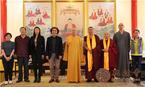 会谈结束后双方一起合影留念,青海省佛协副会长兼秘书长噶尔哇阿旺桑波、ACFC法中文化协会会长石镌、弘法寺对外交流委员会主任石忠耀等陪同会见。(文:南海佛教\图:顿俊)
