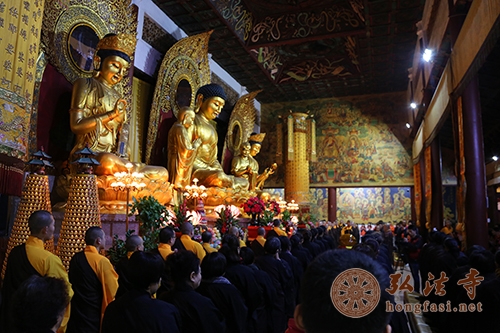佛经云“闻钟声、烦恼清、智慧长、菩提生”。钟声敲响108下,可去除人生108种烦恼,获得吉祥和安乐。弘法寺按照历年的传统,于31日晚在大雄宝殿自行举行新年祈福法会,祈愿新的一年风调雨顺、国泰民安。同时,敲响新年钟声传播佛陀的慈悲大爱,赐给众生新的幸福、新的希望,祖国昌盛、人民安康。现场参加活动的有弘法寺法师、长住义工以及检查工作和安全值守的市区相关管理部门的负责人和工作人员共100多人。