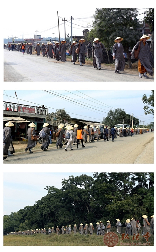 上午8时许,参加尼泊尔中华寺三坛大戒法会的众戒子,头戴斗笠,身披衲衣,手持钵盂,脚踏芒鞋。从佛陀故乡的蓝毗尼中华寺出发,沿着佛陀的足迹前行,最终到达蓝毗尼圣园。一路托钵行脚,威仪具足,接受沿途信众的捐款布施。