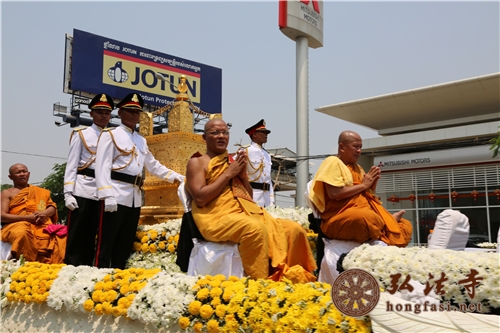 华贵的灵车用柬埔寨美丽和素洁的国花“隆都花”,还有茉莉花、槟榔花、白玫瑰等鲜花装饰得庄严而素净,十位训练有素的柬埔寨御林卫士全程抬棺护法,恭迎和护卫着中国一代高僧的舍利顺利抵达乌廊山波莱波浪寺永久安奉,护佑着友好和善良的柬埔寨人民,也使古老高棉流传至今的那个“百年预言”,得以圆满实现。