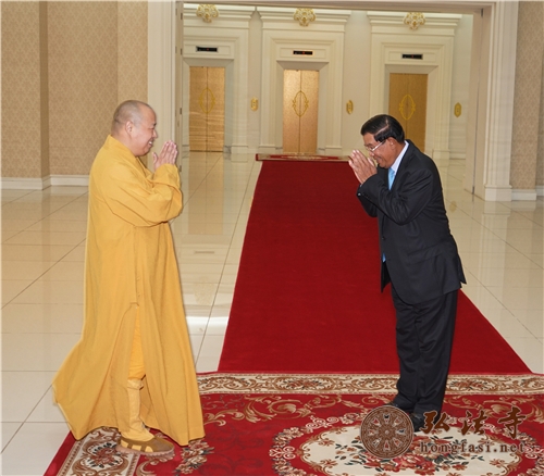 印顺大和尚对洪森首相说:“在未来的日子里,我和中国佛教界,尤其是海南、广东佛教界,一定会为‘光明行’计划极尽绵薄之力!”(文/徐鲁)