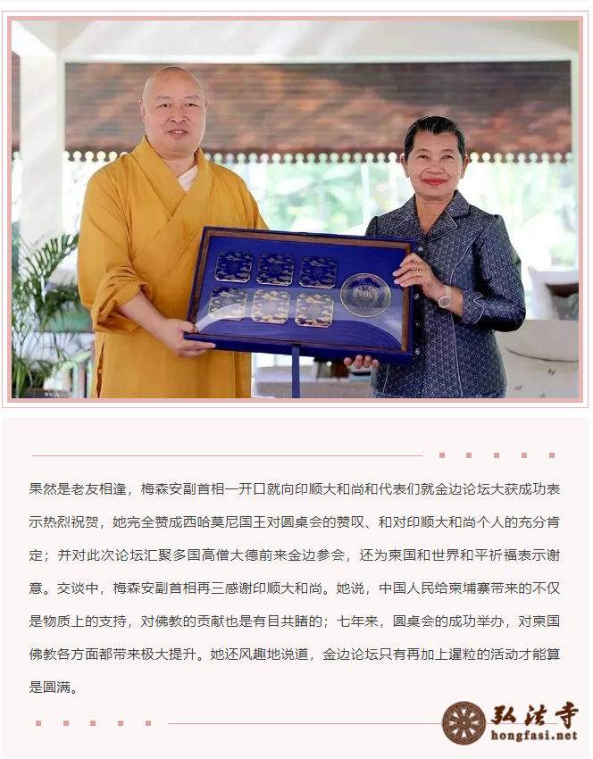 2022年12月16日上午,结束了南海佛教圆桌会金边论坛的多国嘉宾,刚刚抵达暹粒的索菲特大酒店,就接到信息,柬埔寨副首相梅森安马上就要来酒店会见代表一行。大家感到一阵惊喜,又带着几分期盼,因为梅森安副首相不仅是印顺大和尚的老朋友、也是南海佛教圆桌会的铁杆朋友,只是因为疫情的影响,大家已经快三年没有面对面一起交流了。