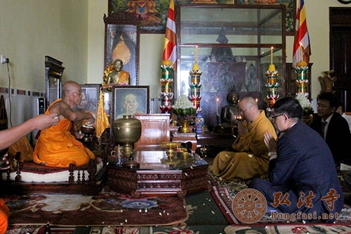 上午九点四十分,代表团抵达乌那隆寺会见柬埔寨大宗派最高僧王狄旺长老。刚刚结束越南卫塞节活动的狄旺长老,不顾舟车劳顿,安排全寺上下的法师列队迎接,以最隆重的欢迎仪式接待代表团。狄旺长老甫一见到印顺大和尚,立即紧紧握住他的手,两人携手步入大殿。随后,陈宗荣副局长与印顺大和尚于香案前点燃佛灯,狄旺长老带领僧众为来访的成员诵经祈福。结束欢迎仪式后,双方代表在会客厅进行了会谈。
