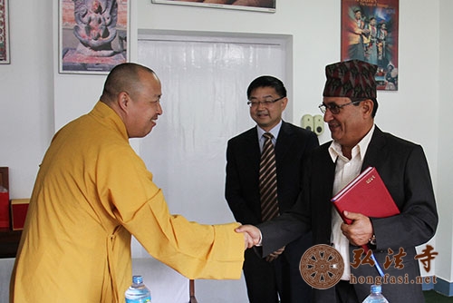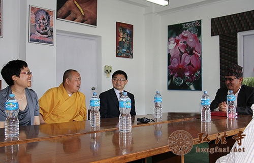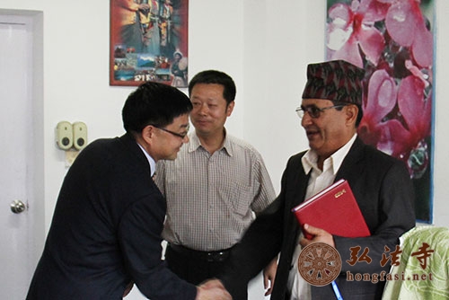 弘法网尼泊尔讯:2014年5月15日,由中国国家宗教事务局陈宗荣副局长率代表团一行在中国驻尼泊尔大使吴春太及其夫人的陪同下会见尼泊尔文化部部长Bhim Prashad,中国佛教协会副会长、海南省佛教协会会长、尼泊尔中华寺、深圳弘法寺方丈印顺大和尚作为代表团成员参与此次活动。