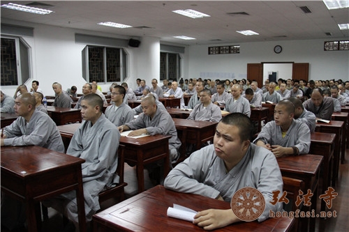 弘法寺为响应2014年中佛协在全国佛教界开展“宗教政策法规学习月”的号召,组织佛学院全体师生、第八期居士培训班学员及常住义工开展落实“发挥正能量,共筑中国梦”为主题的宗教政策法规学习活动。2014年5月21日晚上7点,弘法寺佛学院第六课室举行了专题讲座学习。