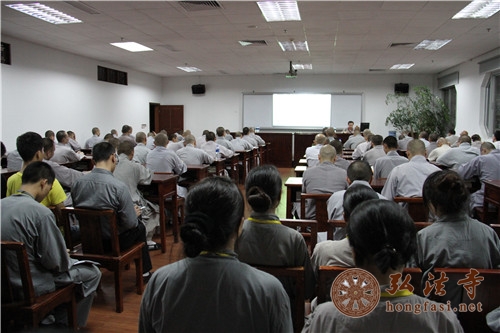 弘法网讯:弘法寺为响应2014年中佛协在全国佛教界开展“宗教政策法规学习月”的号召,组织佛学院全体师生、第八期居士培训班学员及常住义工开展落实“发挥正能量,共筑中国梦”为主题的宗教政策法规学习活动。2014年5月21日晚上7点,弘法寺佛学院第六课室举行了专题讲座学习。