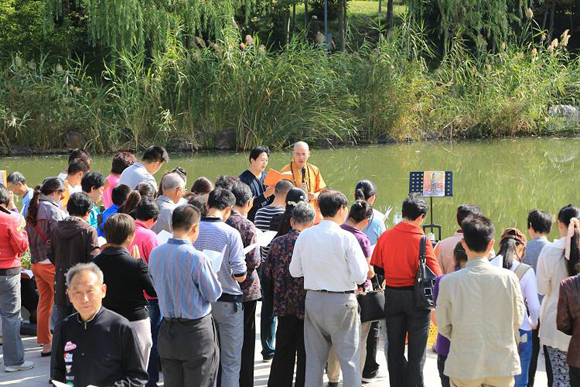2013年10月5日(农历九月初一)弥陀盐城佛友放生组首次放生法会在盐渎公园西北角广场举行。此次法会由盐城市佛教协会副会长、东台弥陀寺住持本源法师主法。上午吉时,一百多名居士护法聚集在公园河畔参加法会,场面欢喜殊胜。