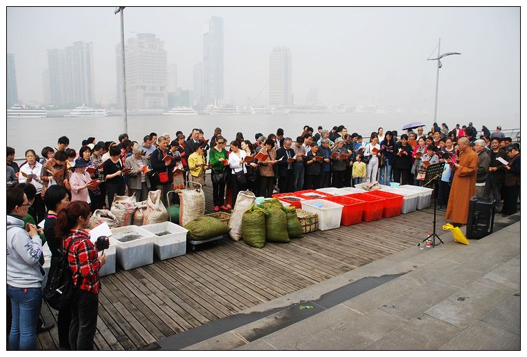 2013年5月11日,早上9点,阳光明媚,在浦东杨家渡渡口举行了5月的放生活动。阳光热烈,来放生的善信们也热情似火,大约有300名大菩萨参加此次放生。本次放生法会,在本源师父的引领下,依照放生仪轨,如理如法念诵相应的经文,祈祷众生吉祥,世界和谐。
