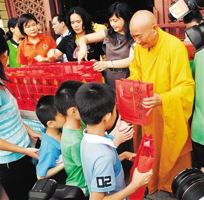 中华佛光文化网广东讯 近日,“2012深圳首届感恩关爱月公益活动”在弘法寺启动。在活动现场,来自深圳市社会福利院的小朋友和深圳市慈善会受助的家庭代表等100多人,领到了深圳弘法寺出品的“弘法禅月”爱心月饼。据悉,活动期间,带着爱心和祝福的月饼,将免费赠送给我市的一些贫困老人、来深工作者和公益团体。(记者陈美寿)