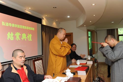 据了解,弘法寺佛学院首期执事培训,共开设有28门功课, 7次讲座学习,对法师们进行了寺庙管理、基本素养能力等方面的培训,包括书法、绘画、演讲与口才等方面的学习受到欢迎,在结业典礼上还对书法比赛获奖的学员进行了颁奖。