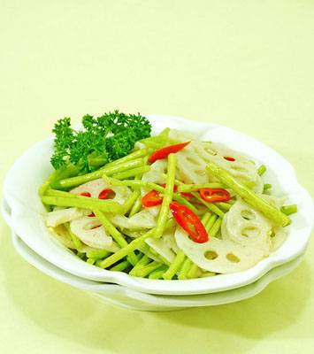 5、起锅,锅中放少许油,投入红尖椒圈,煸炒,然后将已过油的莲藕片和芦蒿段放入,淋少许白醋煸炒,调味,勾一点点芡,出锅装盘即可。